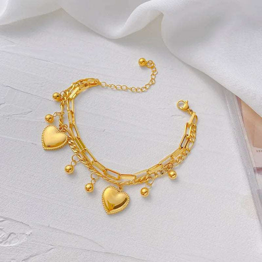 Βραχιόλι ατσάλινο με διπλή αλυσίδα με κρεμαστά καρδιές χρώμα χρυσό (B1366)