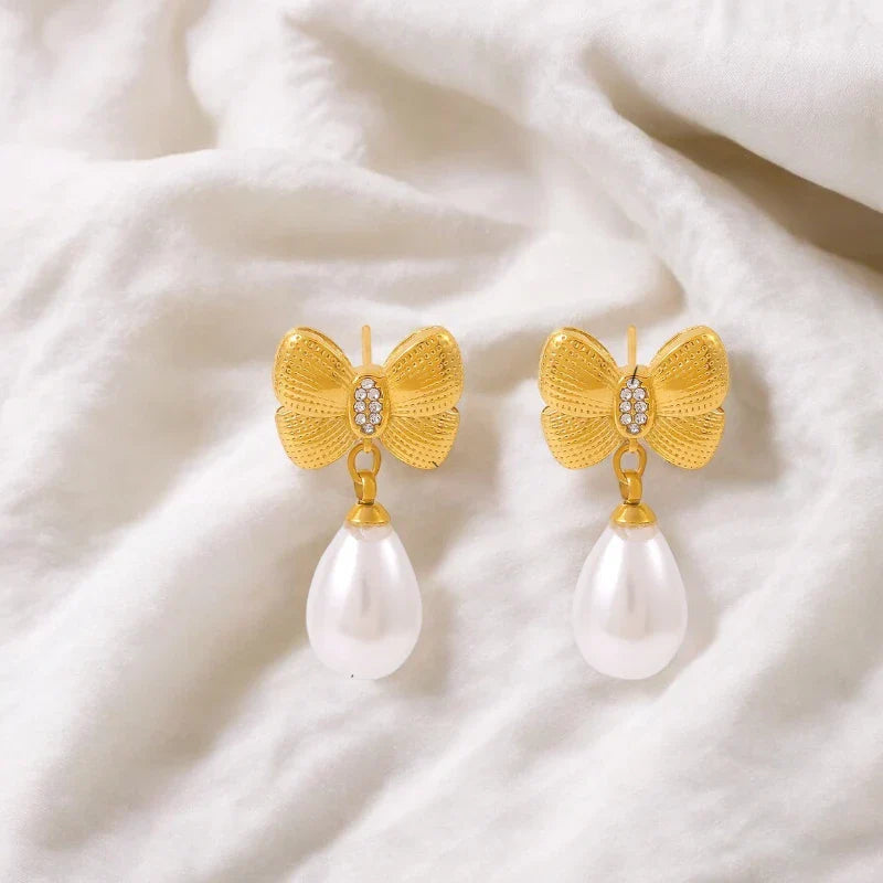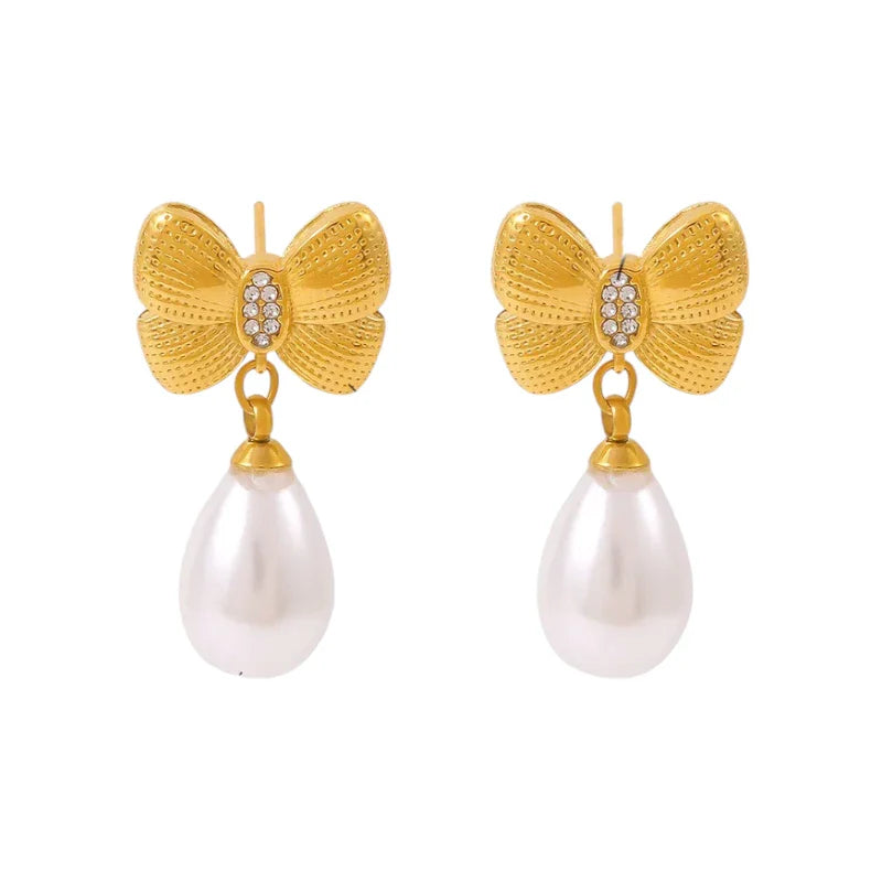Αυτά τα εντυπωσιακά σκουλαρίκια σε σχήμα φιόγκου με κρεμαστή πέρλα και ζιργκόν συνδυάζουν τη θηλυκότητα με τη λάμψη. Η πέρλα δίνει μία κομψή και εκλεπτυσμένη πινελιά, ενώ τα ζιργκόν στην κορυφή χαρίζουν μια διακριτική λάμψη, κάνοντας τα ιδανικά για επίσημες περιστάσεις ή κομψές καθημερινές εμφανίσεις.