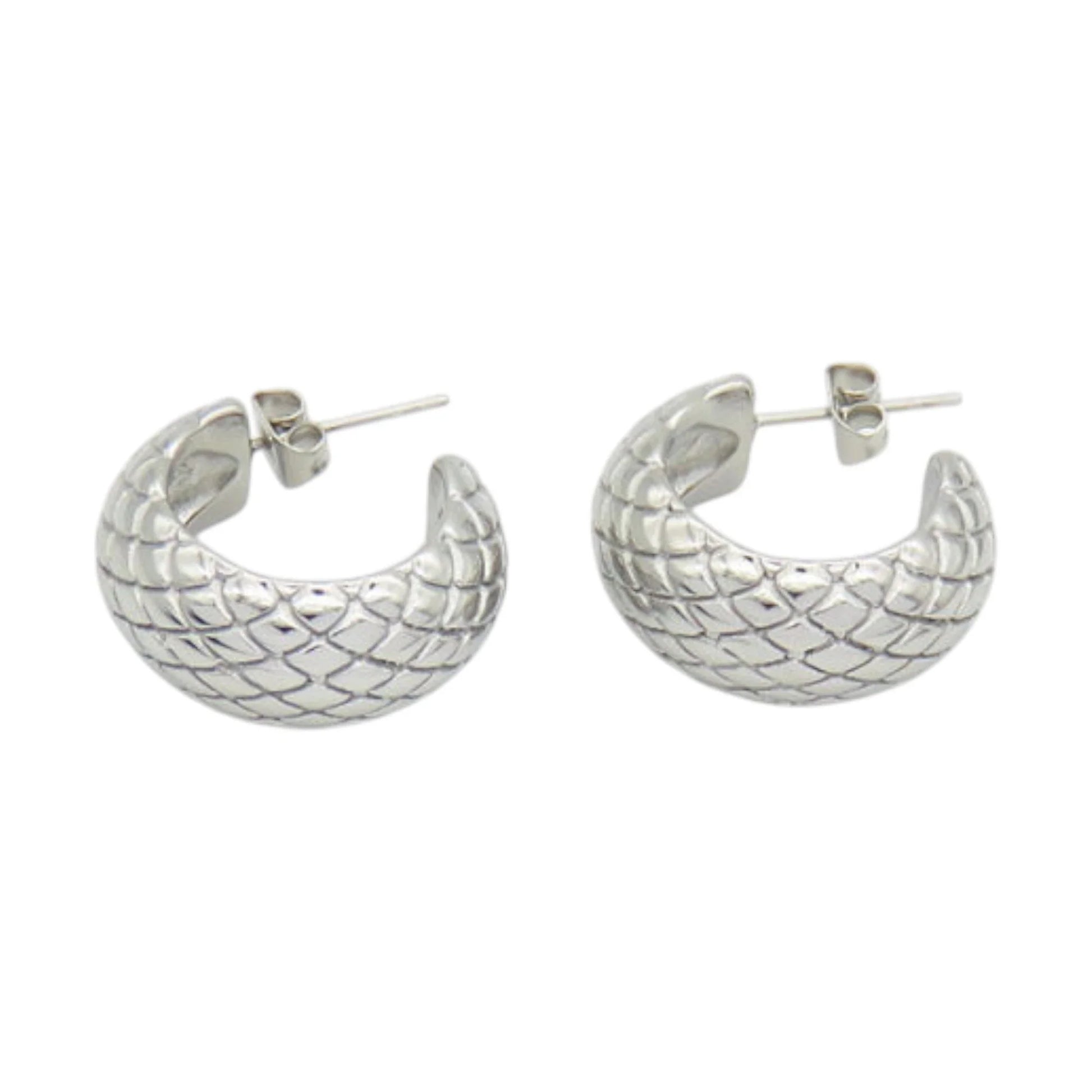 Κομψά σκουλαρίκια κρίκοι από ανοξείδωτο ατσάλι σε εντυπωσιακή ασημί απόχρωση με ανάγλυφη υφή που θυμίζει ψαροκόκαλο. Το chunky design τους τα καθιστά ιδανικά για μοντέρνα looks με χαρακτήρα.