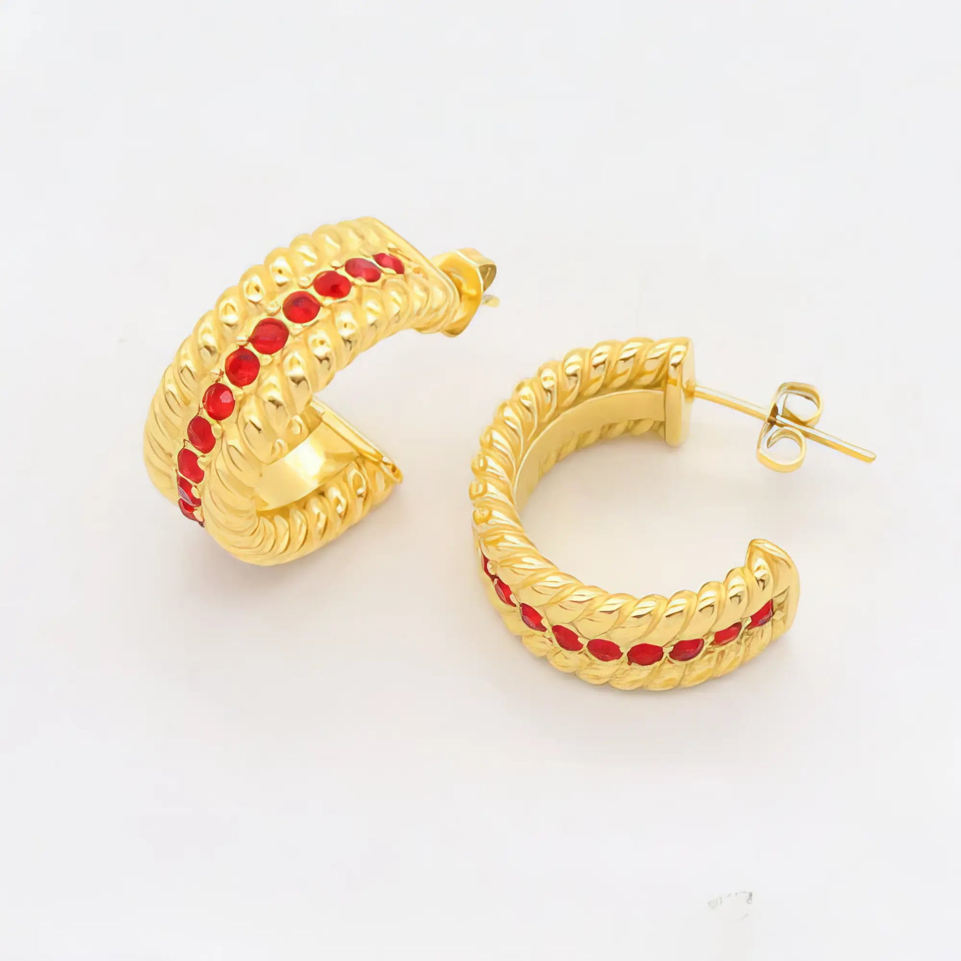 Statement κρίκοι με ανάγλυφο σχέδιο και κόκκινες πέτρες στο κέντρο. Ένα εντυπωσιακό ζευγάρι που θα απογειώσει τα looks σου.