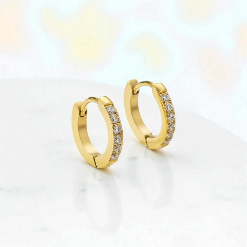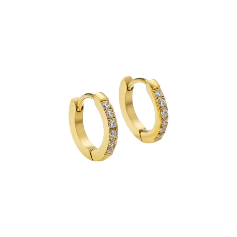 Κομψοί μικροί κρίκοι από ανοξείδωτο ατσάλι σε χρυσό χρώμα, διακοσμημένοι με λαμπερά λευκά ζιργκόν στο μπροστινό μέρος. Ένα εκλεπτυσμένο κόσμημα που προσδίδει λάμψη και φινέτσα σε κάθε σας εμφάνιση.