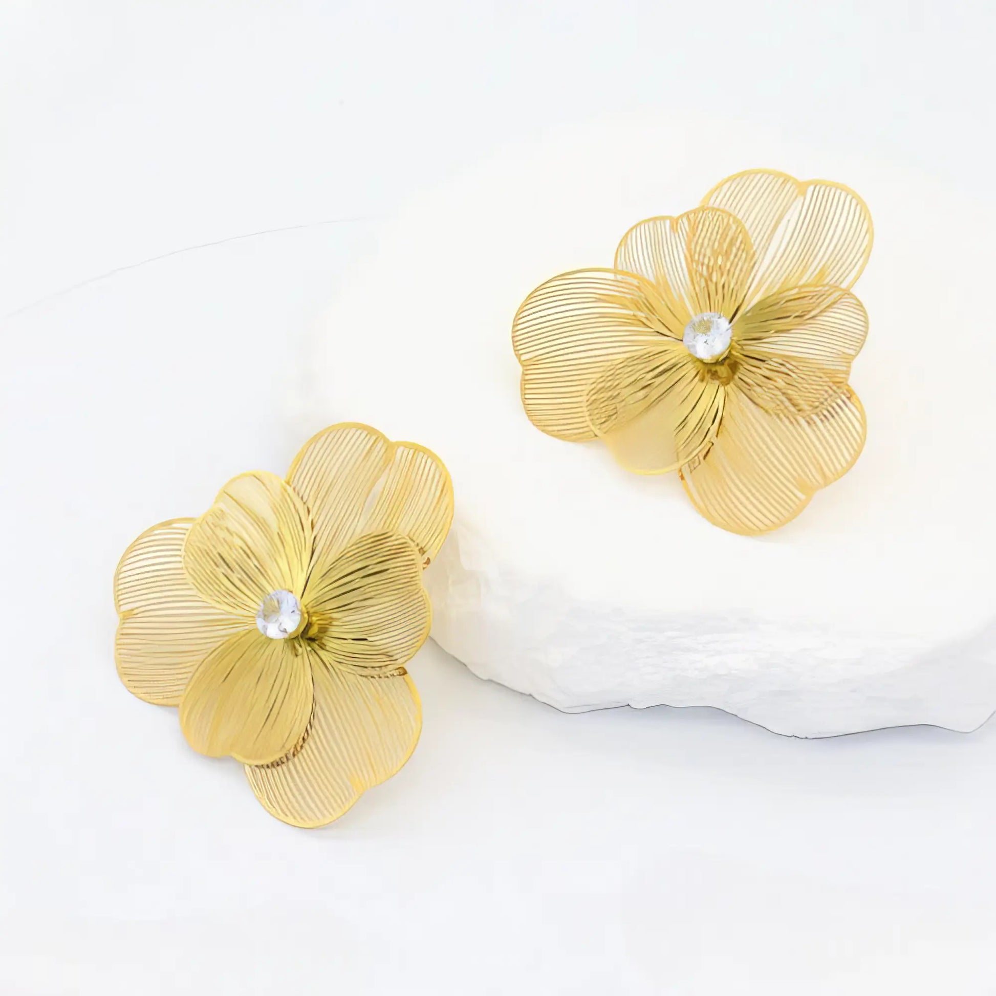 Μεγάλα, statement σκουλαρίκια λουλούδι με διαφανή πέτρα στο κέντρο. Κομψά και εντυπωσιακά.
