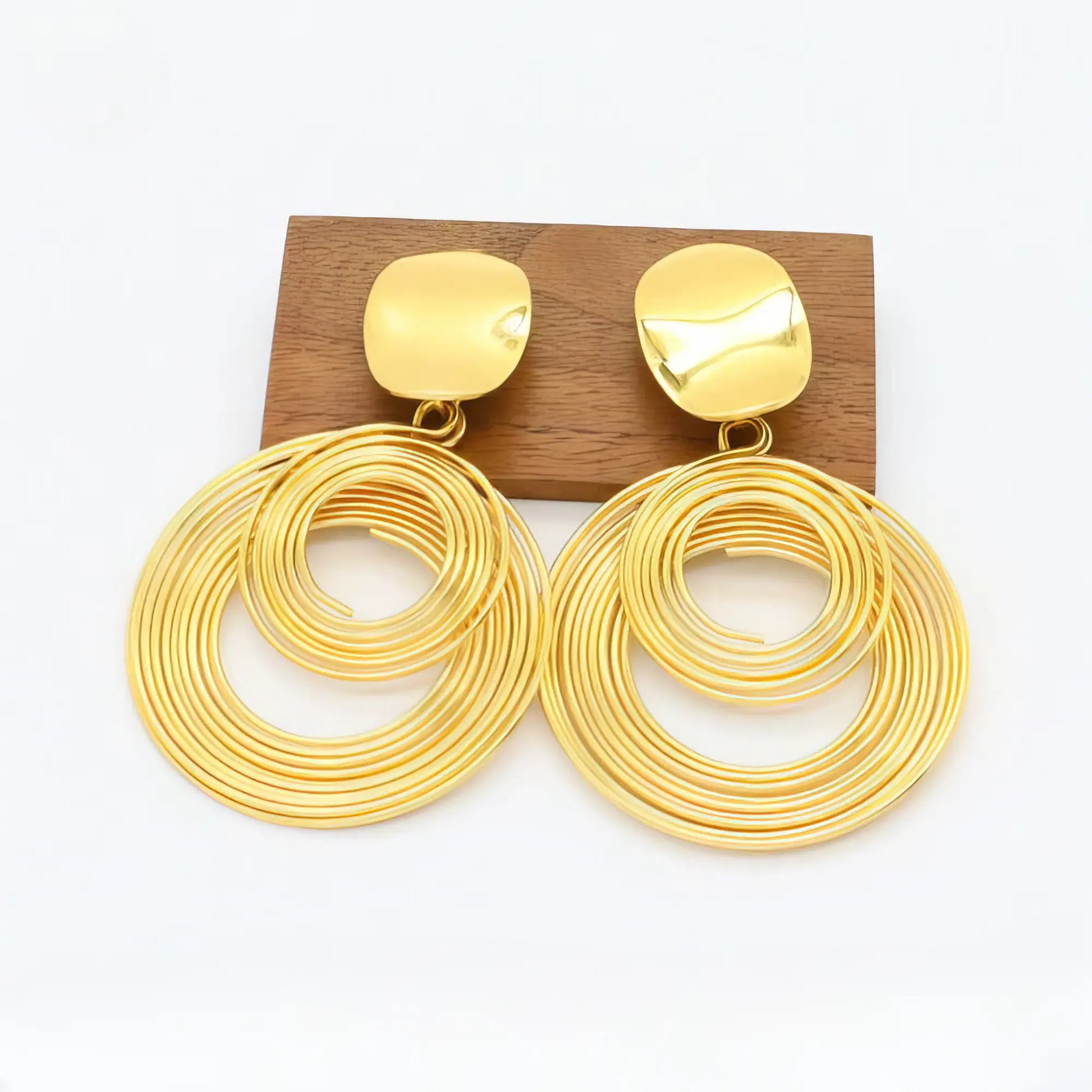 Statement κρίκοι με διπλούς χρυσούς κύκλους από ανοξείδωτο ατσάλι. Εντυπωσιακοί, μοντέρνοι και άκρως κομψοί – το απόλυτο must για fashionistas.