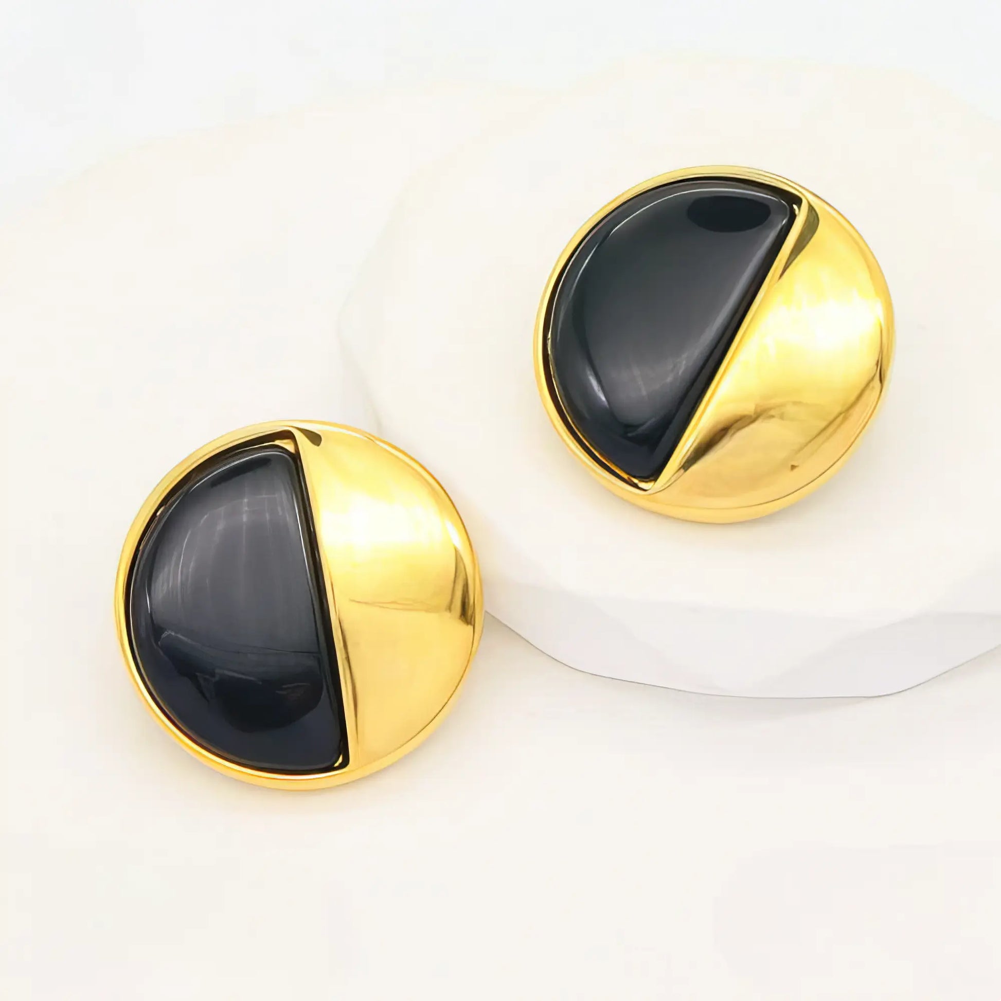 Κομψά σκουλαρίκια σε στρογγυλό σχέδιο με κομψό μαύρο και χρυσό. Minimal αλλά ταυτόχρονα επιβλητικά, ταιριάζουν σε κάθε περίσταση.