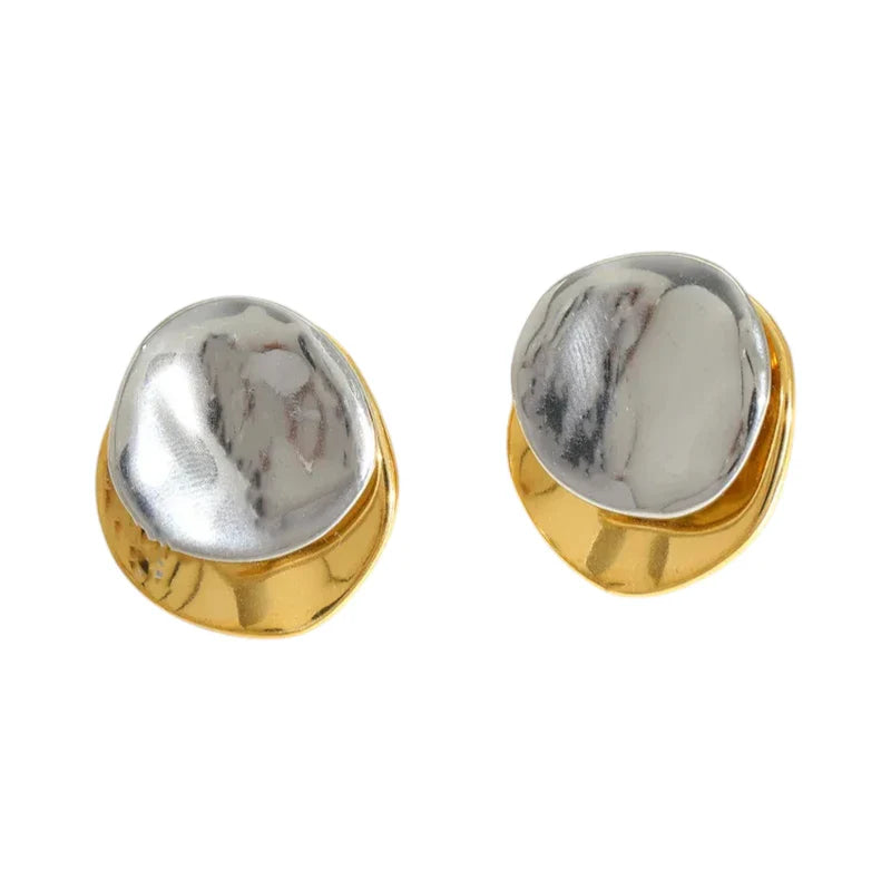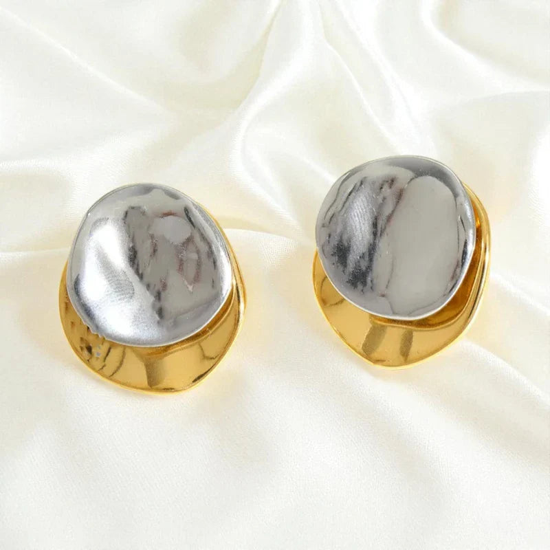 Κομψά και ιδιαίτερα σκουλαρίκια από ανοξείδωτο ατσάλι, με διχρωμία χρυσού και ασημιού και αφηρημένο οργανικό σχήμα. Η γυαλιστερή τους επιφάνεια και ο μοντέρνος σχεδιασμός τα καθιστούν ιδανικά για ξεχωριστές εμφανίσεις.