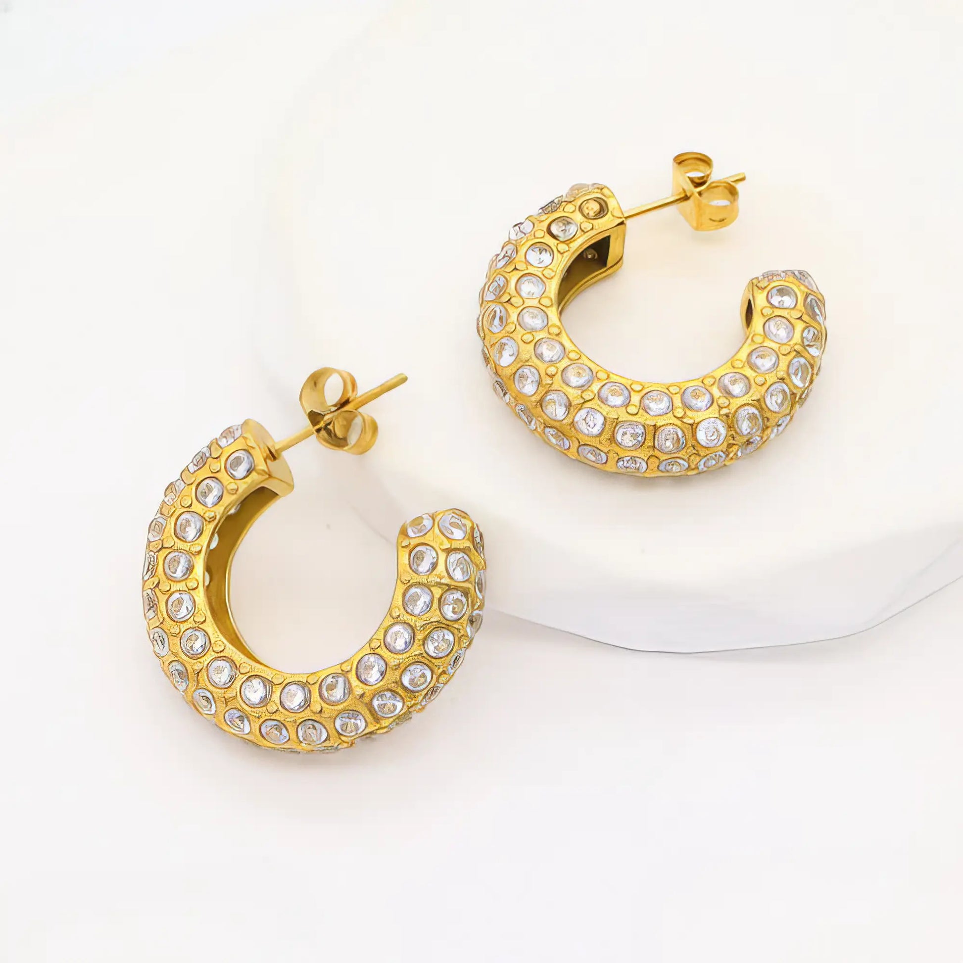 Εντυπωσιακά chunky σκουλαρίκια κρίκοι από ανοξείδωτο ατσάλι, διακοσμημένα με λευκές πέτρες. Ιδανικά για bold εμφανίσεις.