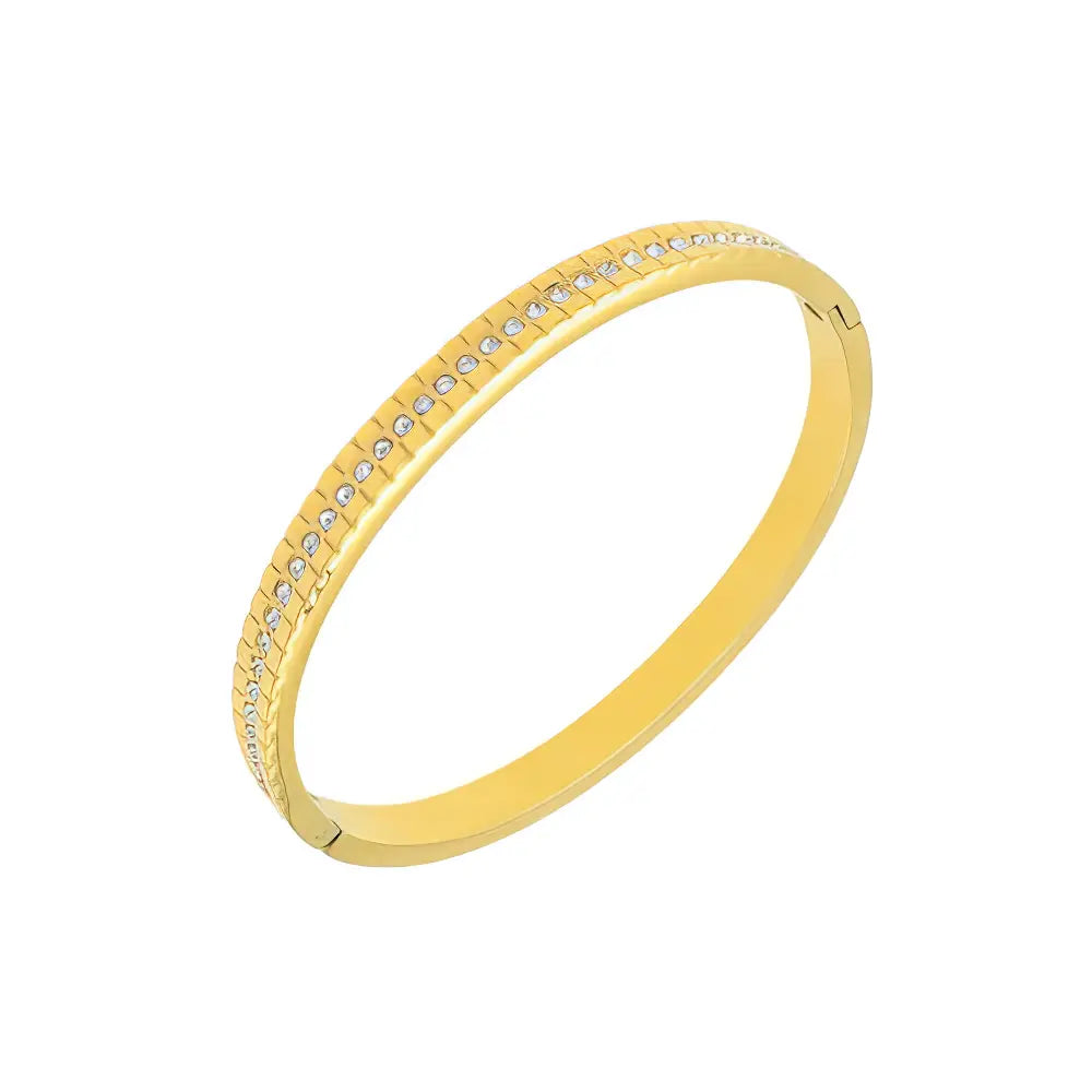 Κομψή χειροπέδα με λευκά ζιργκόν περιμετρικά σε χρυσό χρώμα. Δίνει πολυτέλεια και διακριτική λάμψη σε κάθε εμφάνιση.