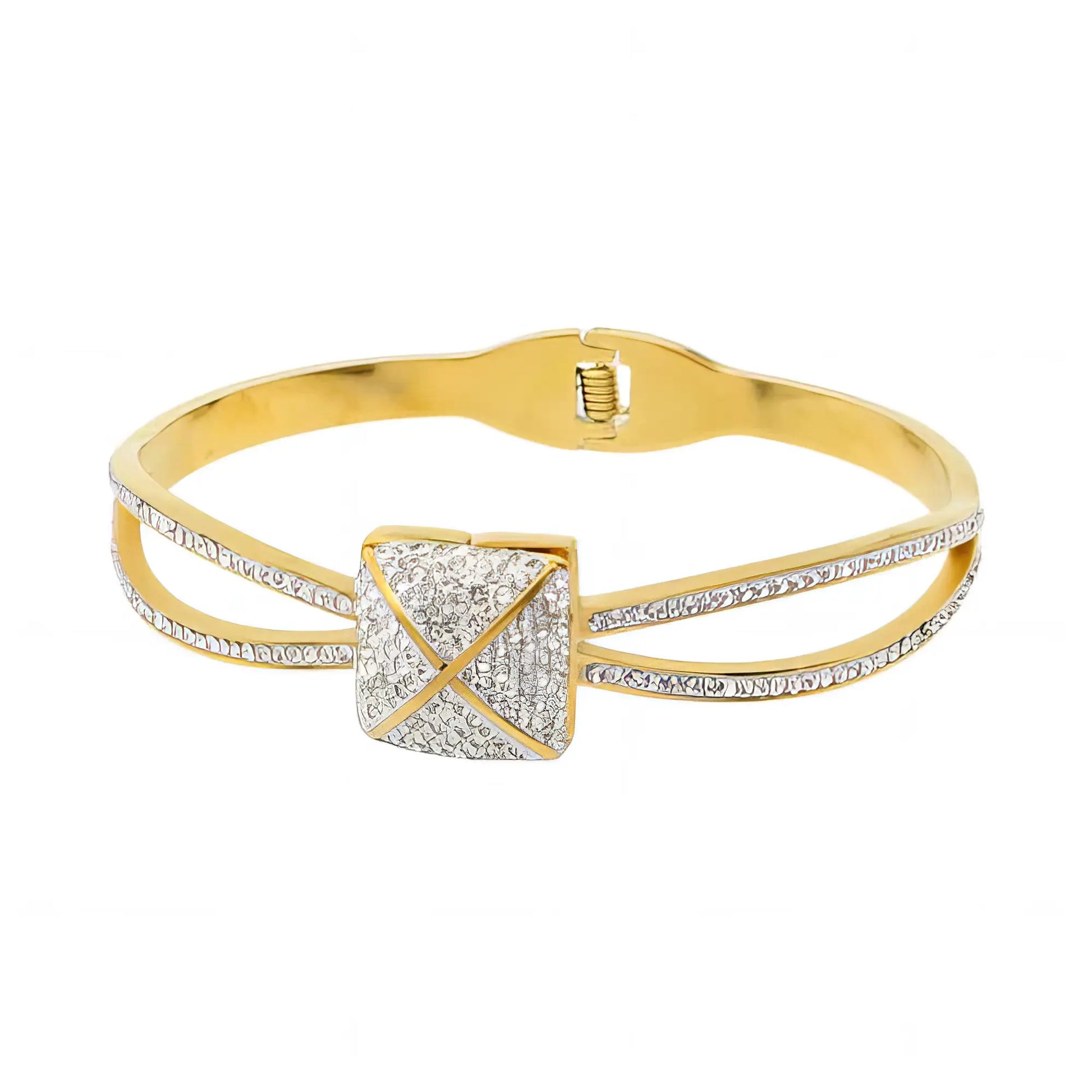 Ένα κομμάτι που ξεχωρίζει, αυτή η χρυσή χειροπέδα με ιδιαίτερο πολυγωνικό κέντρο, διακοσμημένο με λευκά ζιργκόν, αποπνέει πολυτέλεια και λάμψη.