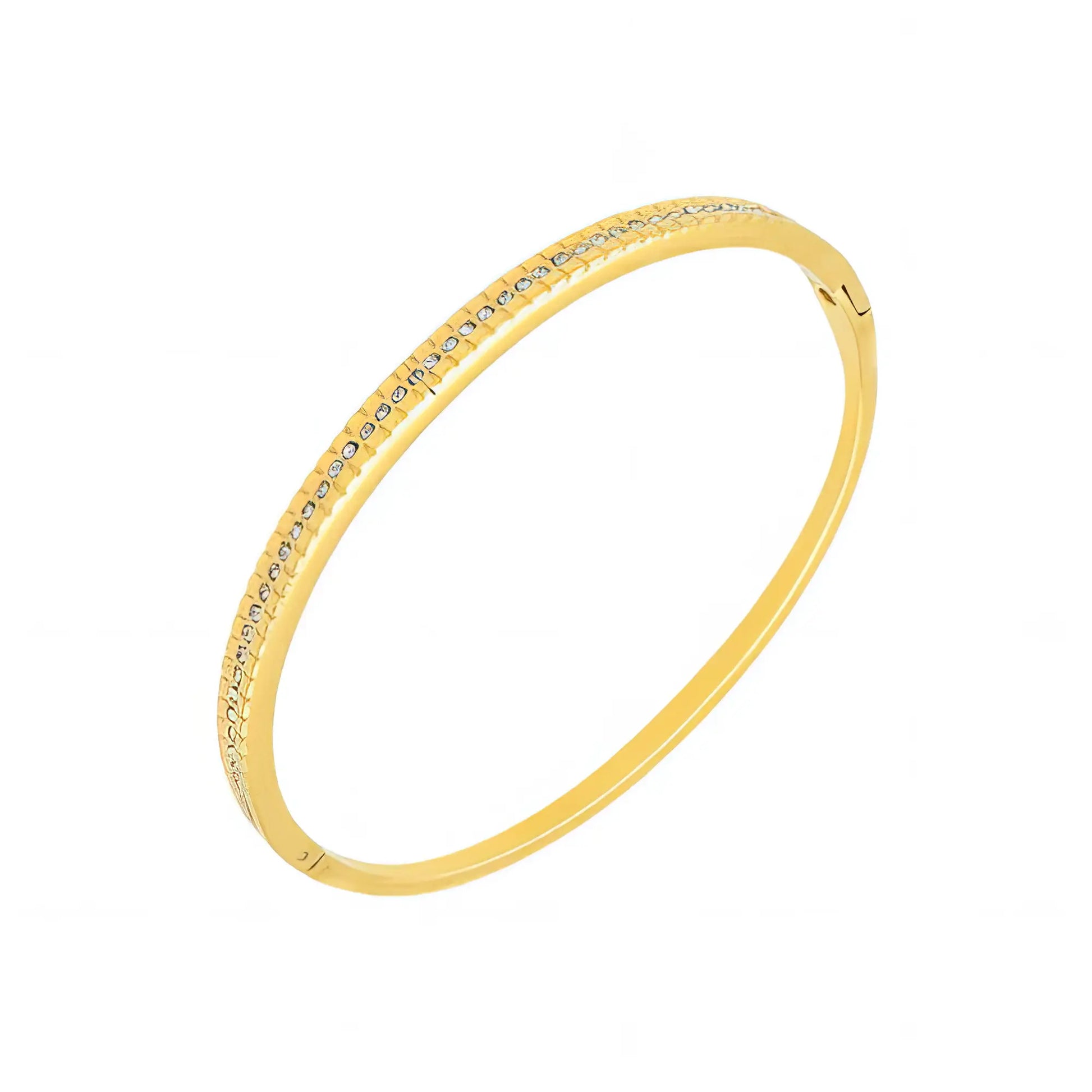 Διακριτική αλλά λαμπερή, αυτή η χρυσή χειροπέδα από ανοξείδωτο ατσάλι διαθέτει ανάγλυφο σχέδιο με λευκά ζιργκόν. Ιδανική για layering ή για κομψή καθημερινή χρήση.