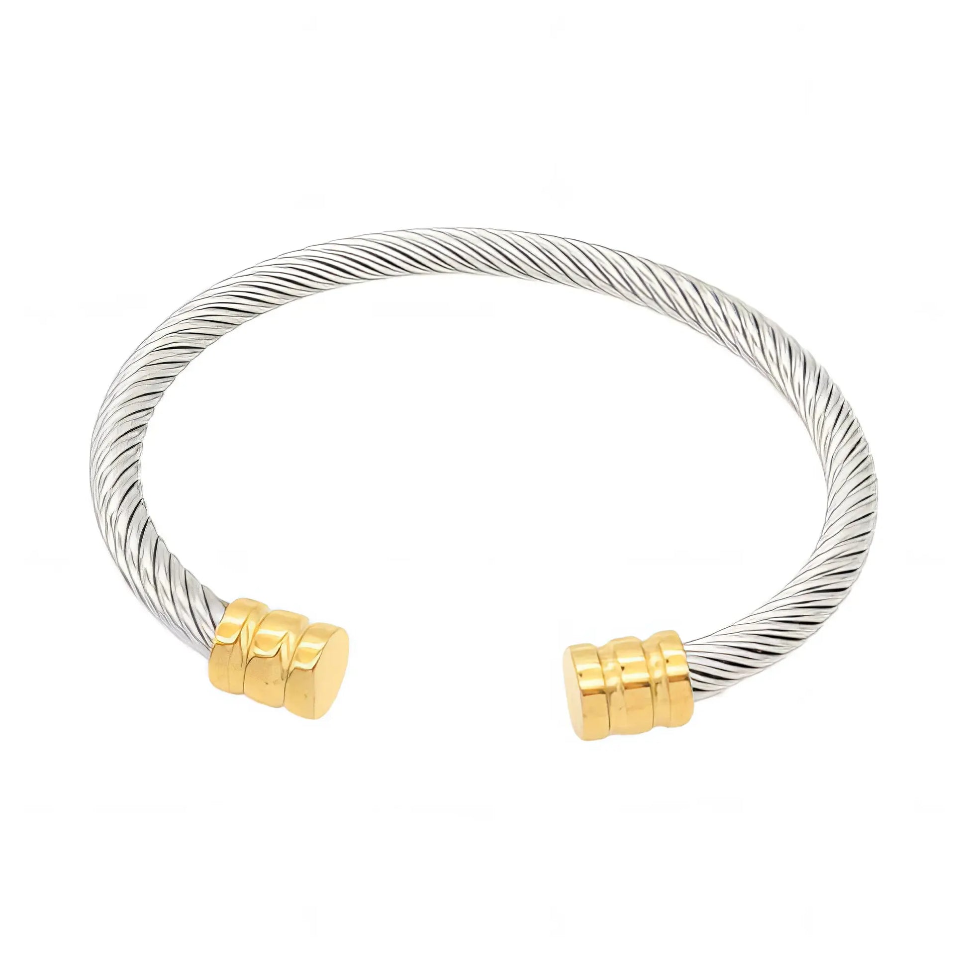 Minimal και κομψό βραχιόλι χειροπέδα σε διχρωμία, με ασημί συρμάτινη βάση και χρυσές μπίλιες στα άκρα. Ιδανικό για unisex στυλ.
