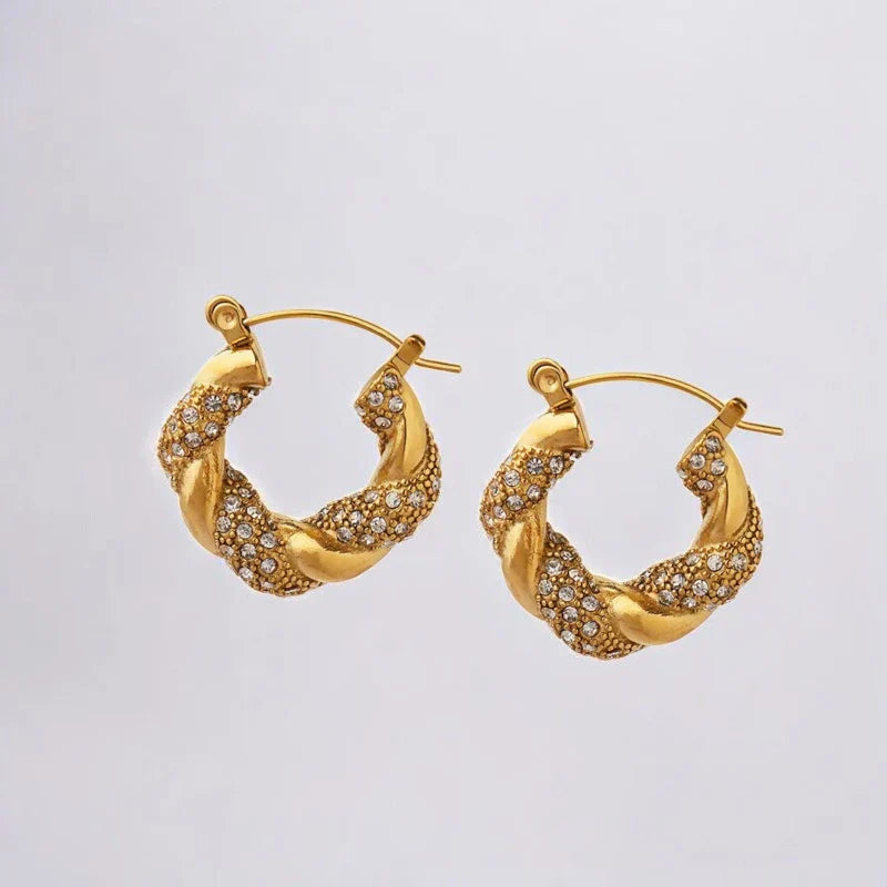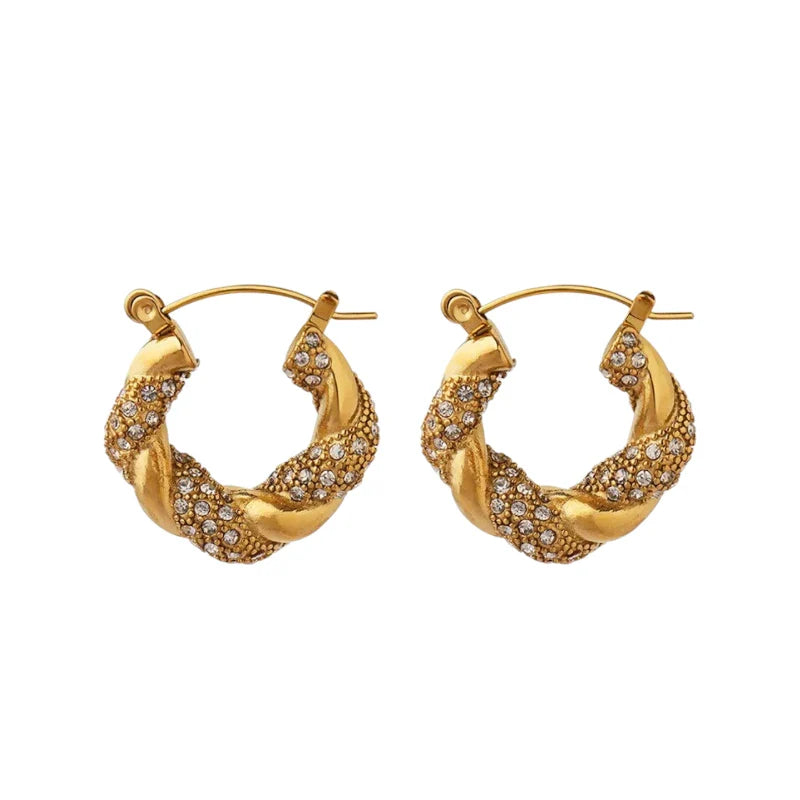 Περιγραφή: Αυτοί οι εντυπωσιακοί κρίκοι από επιχρυσωμένο ανοξείδωτο ατσάλι διαθέτουν κομψές στριφτές λεπτομέρειες, διακοσμημένες με λαμπερά ζιργκόν που αντανακλούν το φως με κάθε κίνηση. Το πολυτελές φινίρισμα τους τους καθιστά ιδανικούς για βραδινές εξόδους ή για να προσθέσετε μια δόση λάμψης στις καθημερινές σας εμφανίσεις.