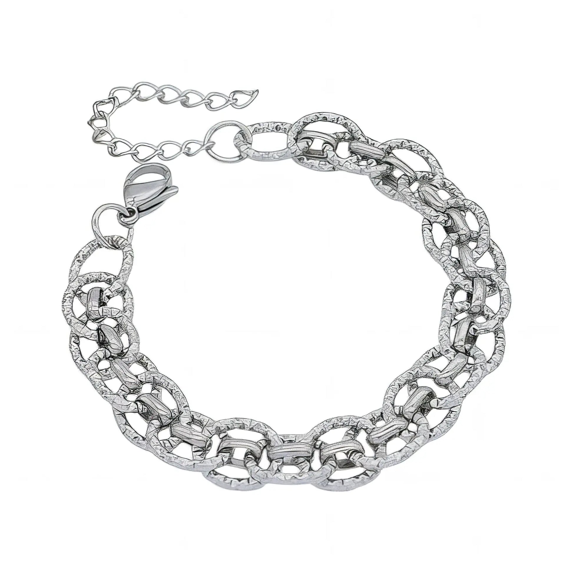 Ατσάλινο Ασημί Βραχιόλι με Διπλούς Κρίκους και Ανάγλυφη Υφή – 10.5mm (B3478)