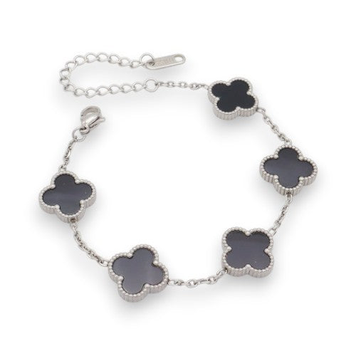 Ατσάλινο Ασημί Βραχιόλι με Μαύρα Τετράφυλλα (B3506)