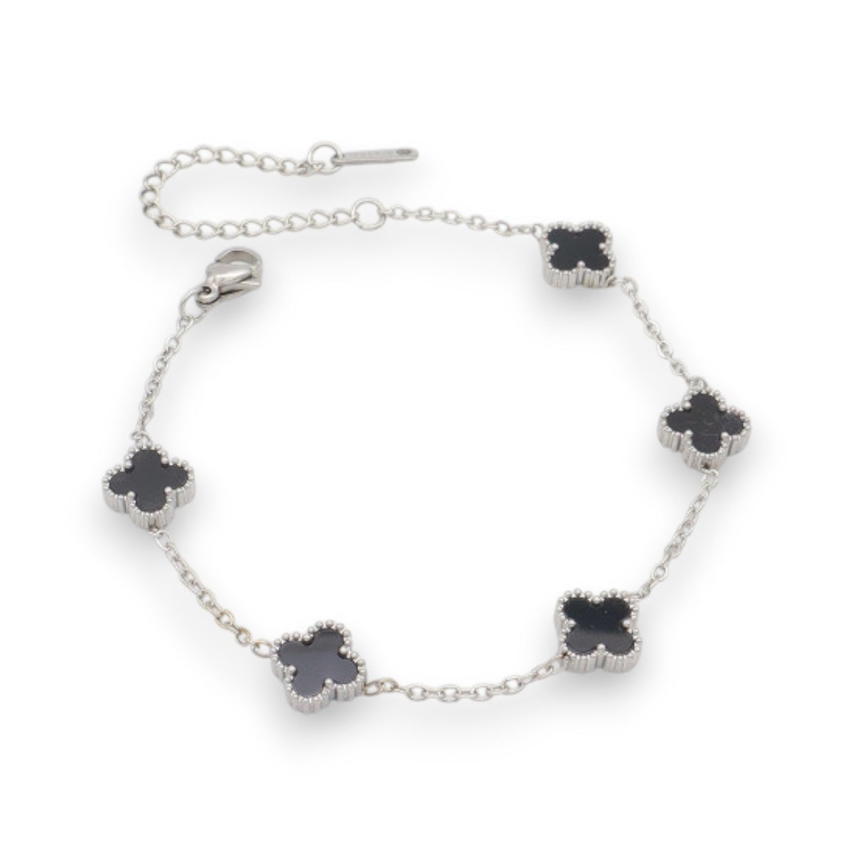 Ατσάλινο Ασημί Βραχιόλι με Μικρά Μαύρα Τετράφυλλα (B3512)