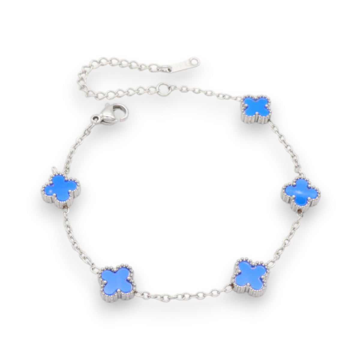 Ανάλαφρο και φωτεινό, αυτό το ατσάλινο βραχιόλι με μικρά τυρκουάζ τετράφυλλα χαρίζει μια πινελιά φρεσκάδας και θετικής ενέργειας σε κάθε look. Το γαλάζιο του σμάλτου συνδυάζεται άψογα με το ασημί, δημιουργώντας ένα κομψό και δροσερό αποτέλεσμα. Φόρεσέ το μόνο του για ένα διακριτικό touch ή συνδύασέ το με τα αντίστοιχα σκουλαρίκια και κολιέ για ολοκληρωμένο καλοκαιρινό στυλ.