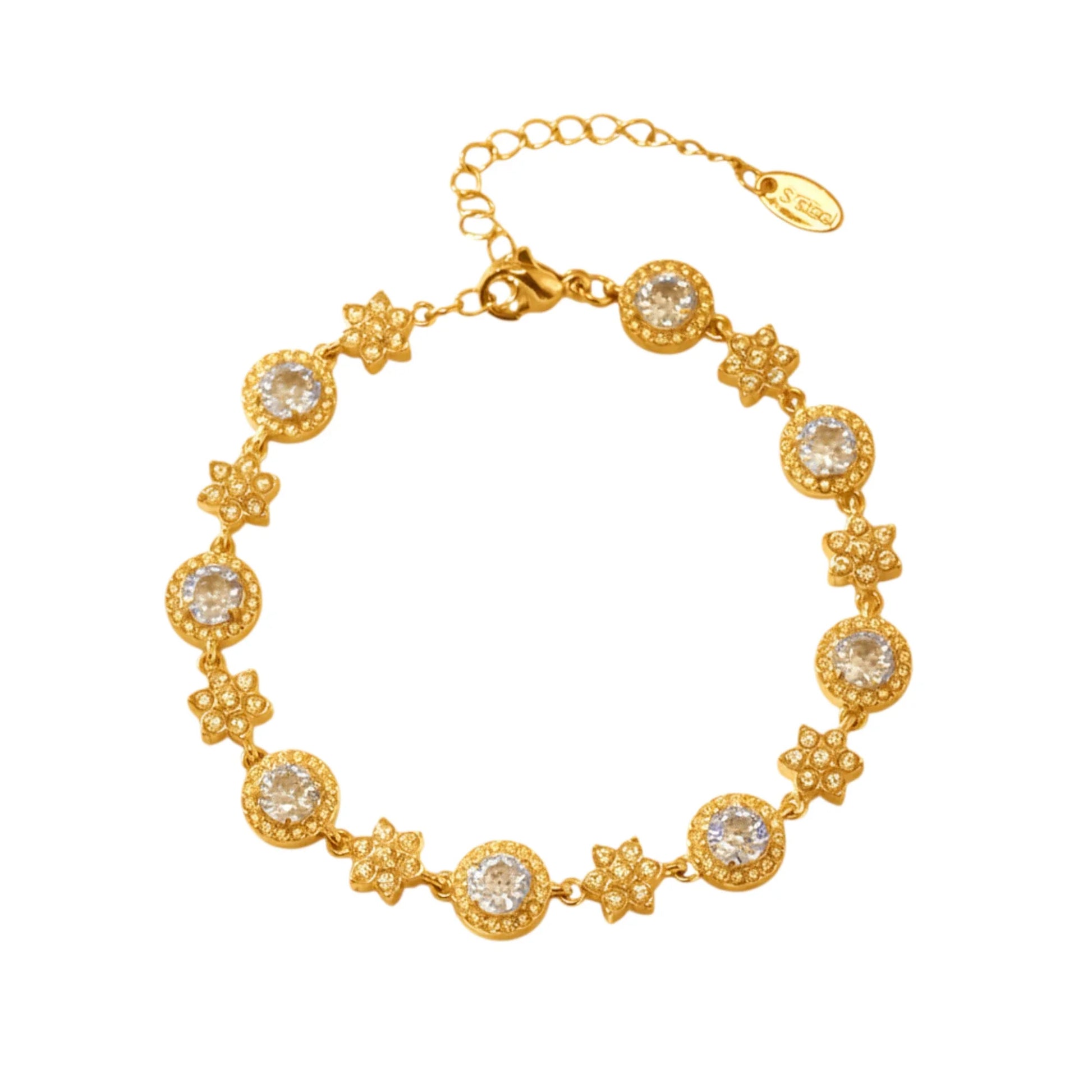 Λαμπερό και παιχνιδιάρικο, αυτό το βραχιόλι από ανοξείδωτο ατσάλι σε χρυσό τόνο συνδυάζει κυκλικά μοτίβα με διακοσμητικά αστέρια, διακοσμημένα με λαμπερά ζιργκόν. Ιδανική επιλογή για να προσθέσεις μία κομψή και νεανική πινελιά στην εμφάνισή σου. Ρυθμιζόμενο μήκος για άνετη εφαρμογή και σταθερό κούμπωμα.