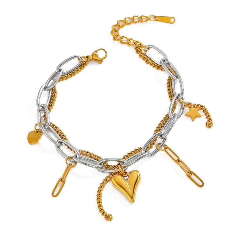 💛 Ατσάλινο Βραχιόλι με Διπλή Αλυσίδα & Κρεμαστά – Ασημί & Χρυσό