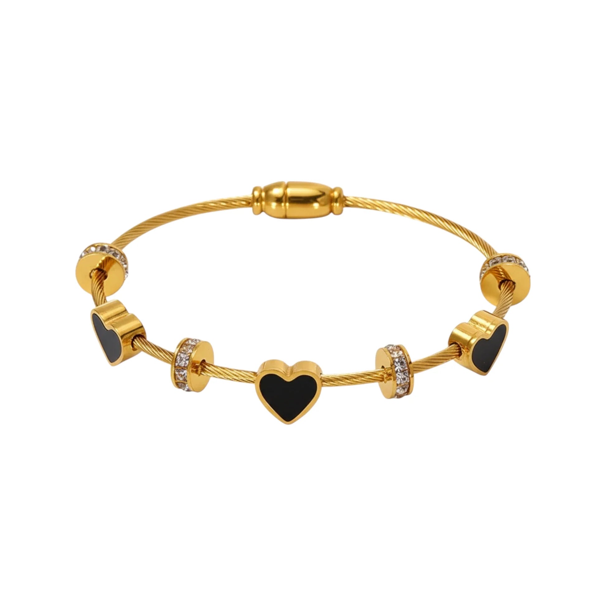 Αυτό το εντυπωσιακό βραχιόλι από ανοξείδωτο ατσάλι σε χρυσή απόχρωση ξεχωρίζει για τον μοναδικό σχεδιασμό του με τρεις καρδιές – δύο μαύρες και μία από φίλντισι – πλαισιωμένες από κυκλικές λεπτομέρειες με λαμπερές πέτρες. Κλείνει με μαγνητικό κούμπωμα για εύκολη και ασφαλή εφαρμογή. Μια μοντέρνα και κομψή πρόταση που προσθέτει στιλ σε κάθε σας εμφάνιση.