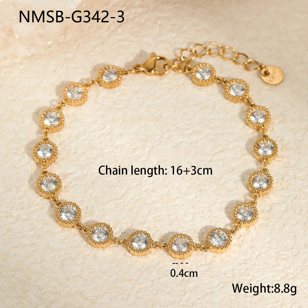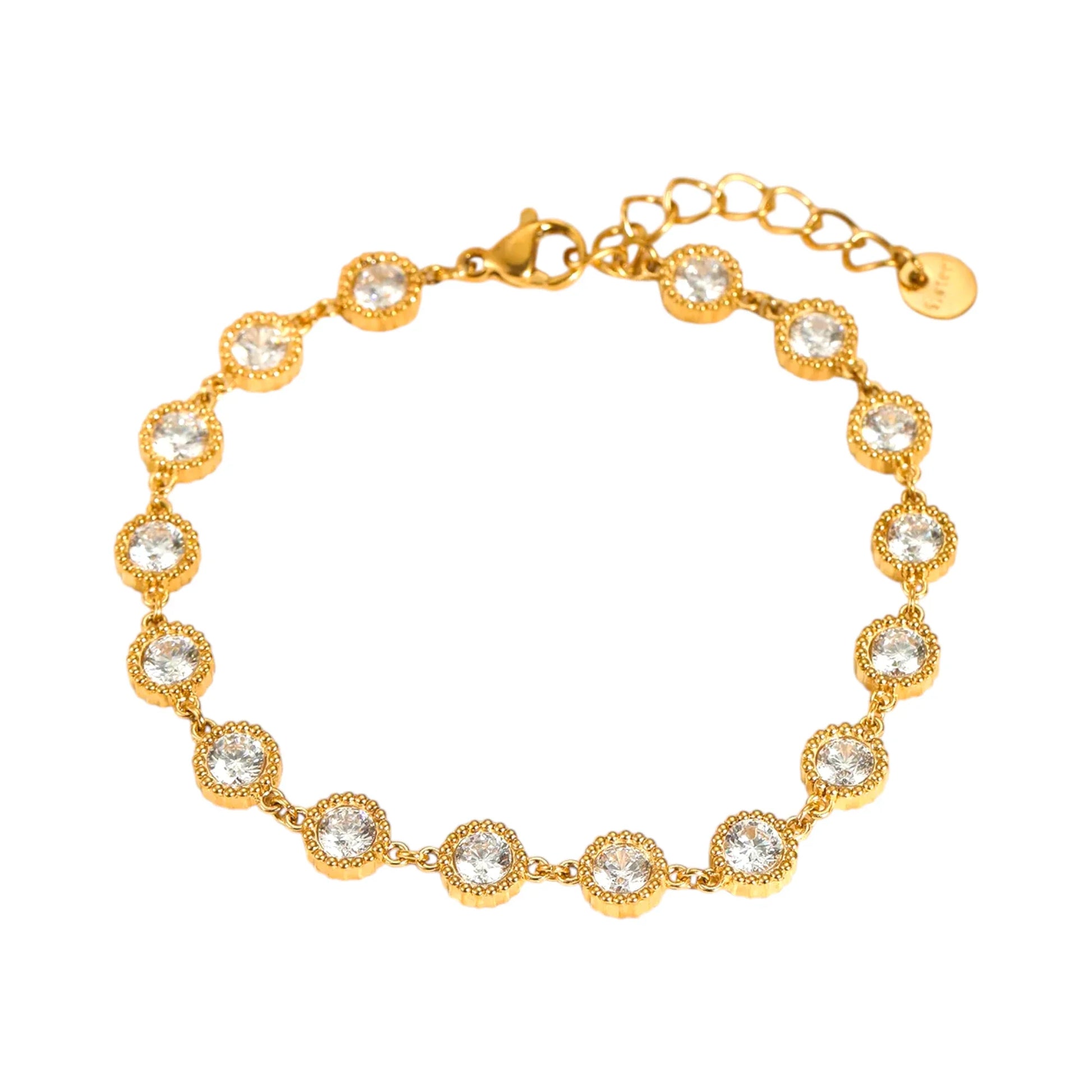 Λεπτεπίλεπτο βραχιόλι από ανοξείδωτο ατσάλι με πολυτελή χρυσή απόχρωση και διαδοχικές λευκές πέτρες τύπου ζιργκόν. Η κομψή του εμφάνιση το καθιστά ιδανικό για καθημερινές αλλά και πιο επίσημες εμφανίσεις. Φοριέται άνετα μόνο του ή συνδυάζεται εύκολα με άλλα βραχιόλια για ένα πιο εντυπωσιακό layering. Διαθέτει προέκταση για ρυθμιζόμενο μήκος και ασφαλές κούμπωμα.