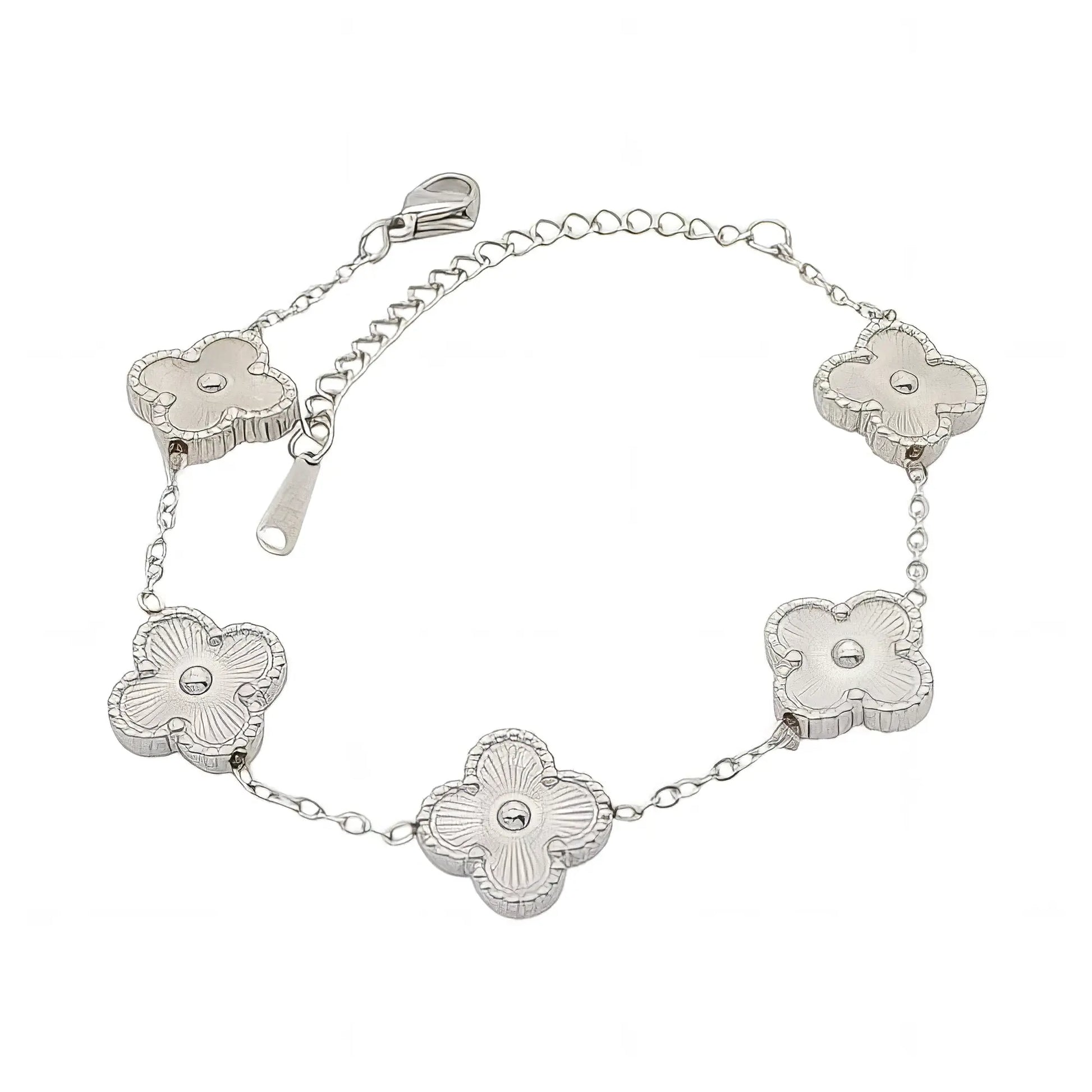 Εντυπωσιακό βραχιόλι με μοτίφ τετράφυλλα σε ασημί χρώμα. Συμβολίζει την καλή τύχη και προσθέτει διακριτική κομψότητα.