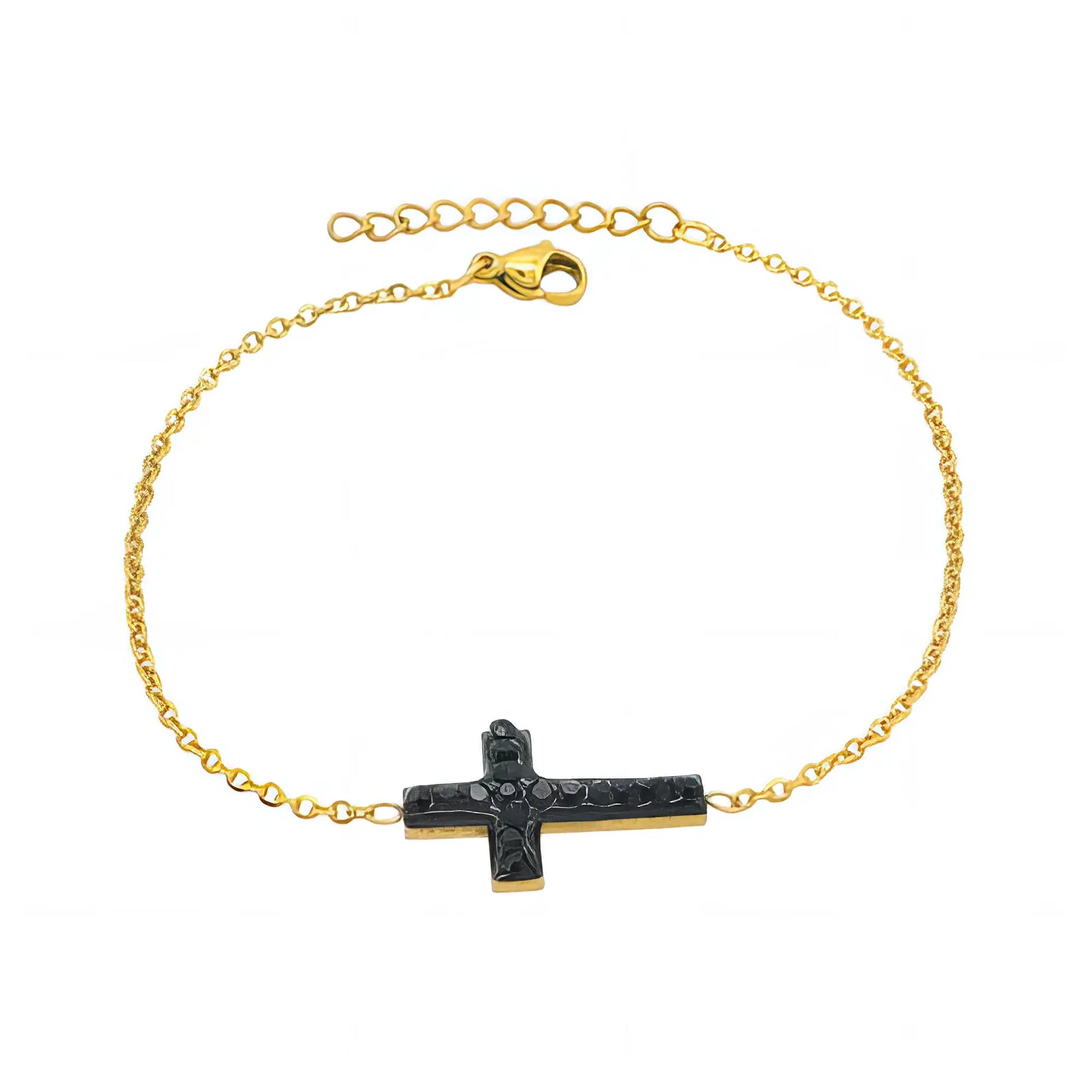 Αναδείξτε τη μοναδικότητά σας με αυτό το εντυπωσιακό βραχιόλι από ανοξείδωτο ατσάλι. Ο σταυρός με τις μαύρες πέτρες προσθέτει μυστήριο και στυλ σε κάθε εμφάνιση – ιδανικό για βραδινές εξόδους αλλά και μοντέρνα καθημερινά outfits.