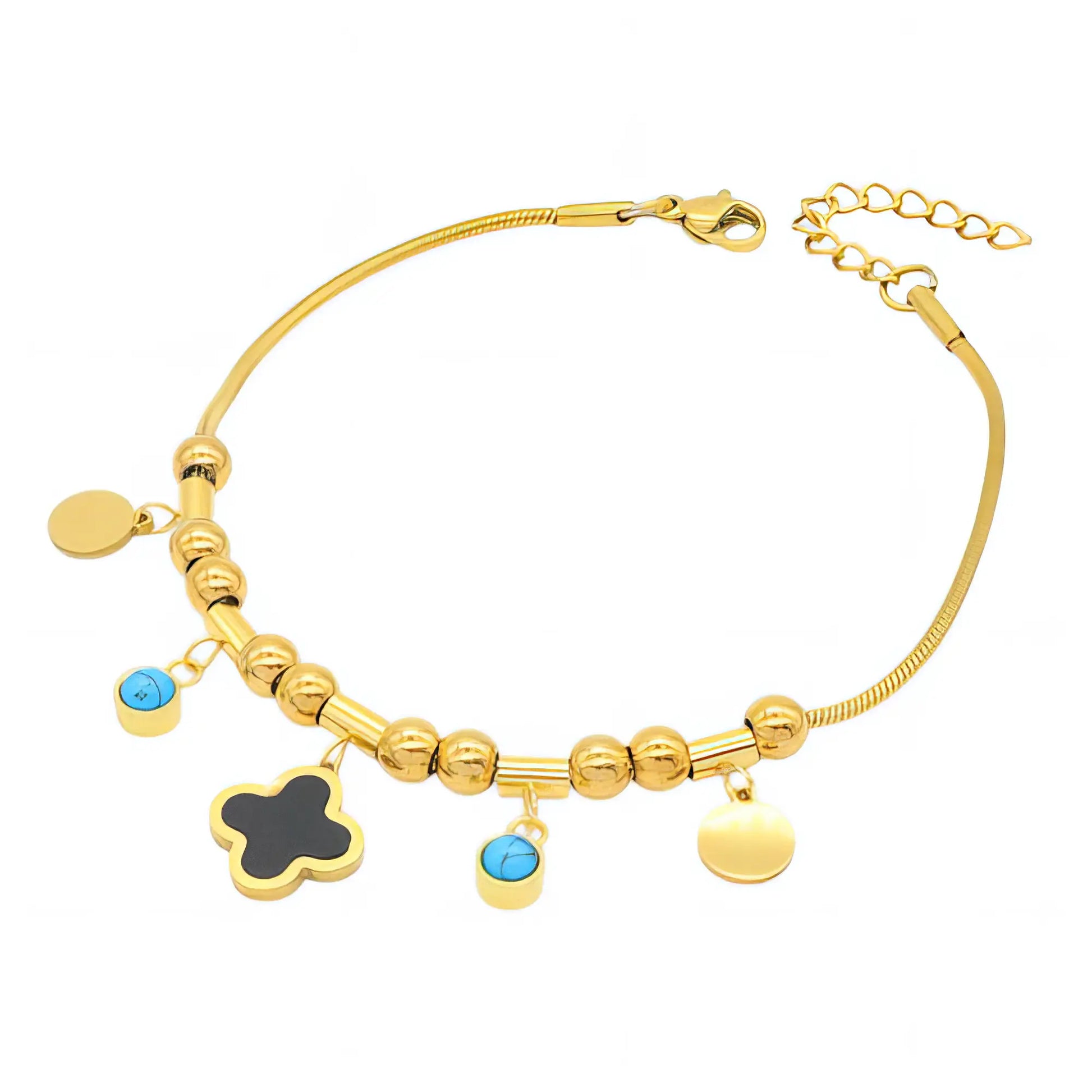 Ένα παιχνιδιάρικο αλλά κομψό βραχιόλι με χρυσές χάντρες, μαύρο τετράφυλλο και τυρκουάζ λεπτομέρειες που μαγνητίζουν τα βλέμματα. Ένα μοναδικό σύμβολο τύχης και στυλ.