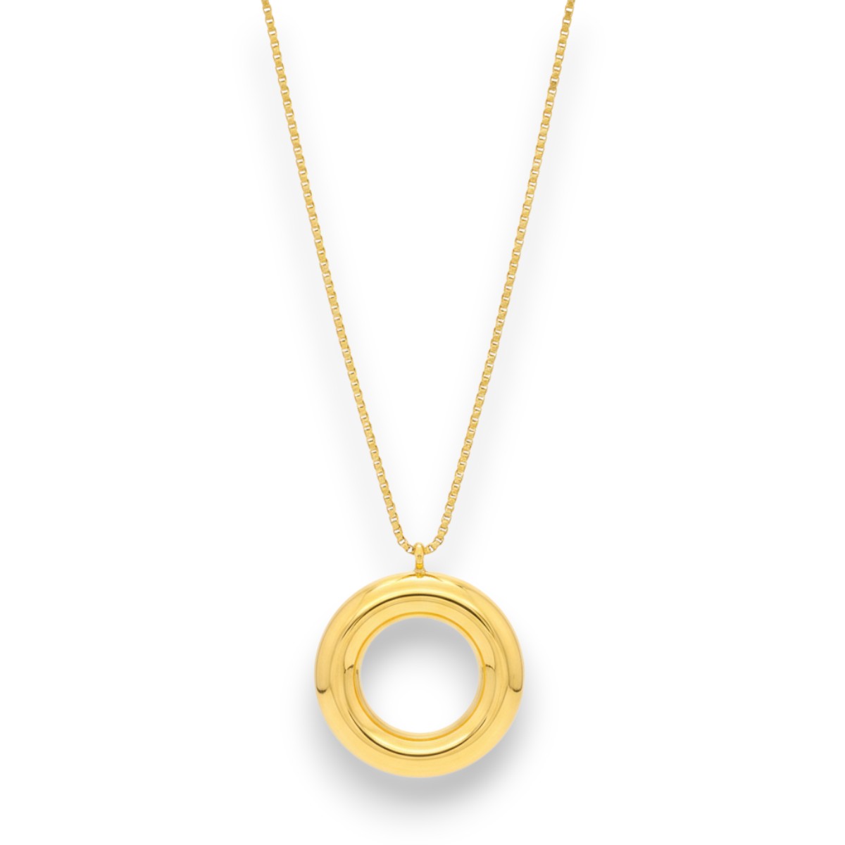 Εντυπωσιακό και μοντέρνο, αυτό το κολιέ με μεγάλο στρογγυλό κρεμαστό αποπνέει πολυτέλεια και δυναμισμό. Το καθρέφτη φινίρισμα του χρυσού και η bold αισθητική του το καθιστούν ιδανικό για fashion-forward εμφανίσεις, είτε σε minimal outfits είτε ως statement κομμάτι πάνω σε total black ή μονόχρωμο look. Συνδύασέ το με μικρότερα χρυσά κολιέ για layered αποτέλεσμα ή με χρυσά σκουλαρίκια κρίκους για πιο ισορροπημένο στυλ.