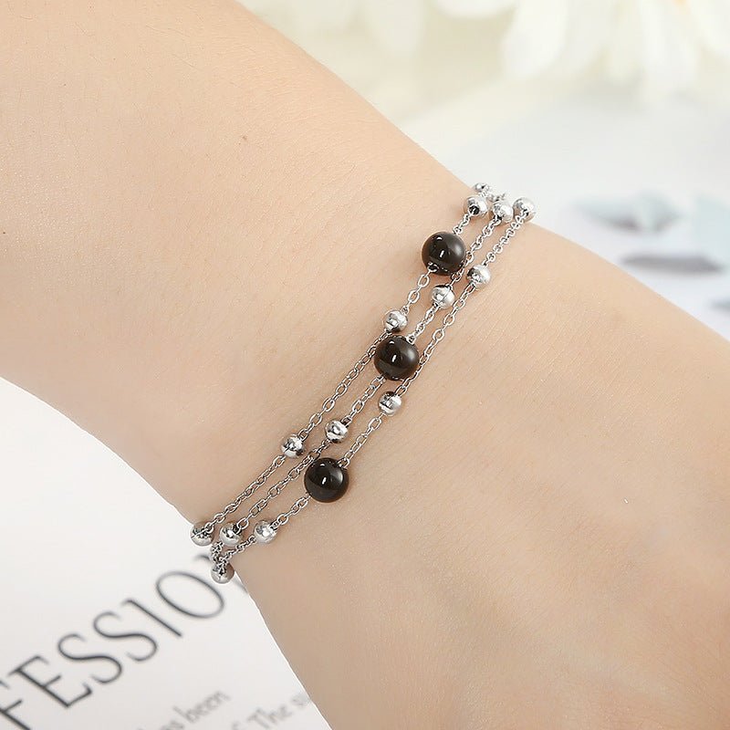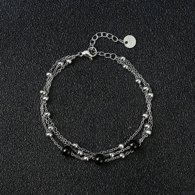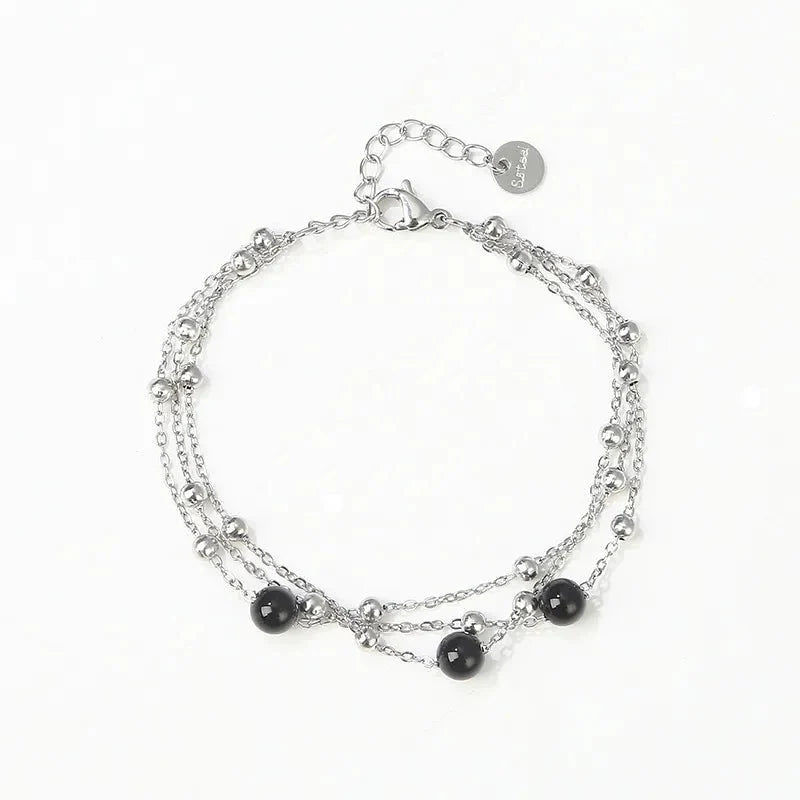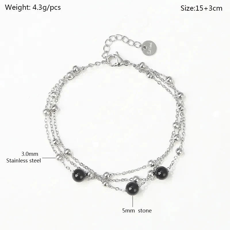 Βραχιόλι ατσάλινο με τριπλή αλυσίδα και μεταλλικές χάντρες και χάντρες από μαύρο αχάτη χρώμα ασημί (B1477)
