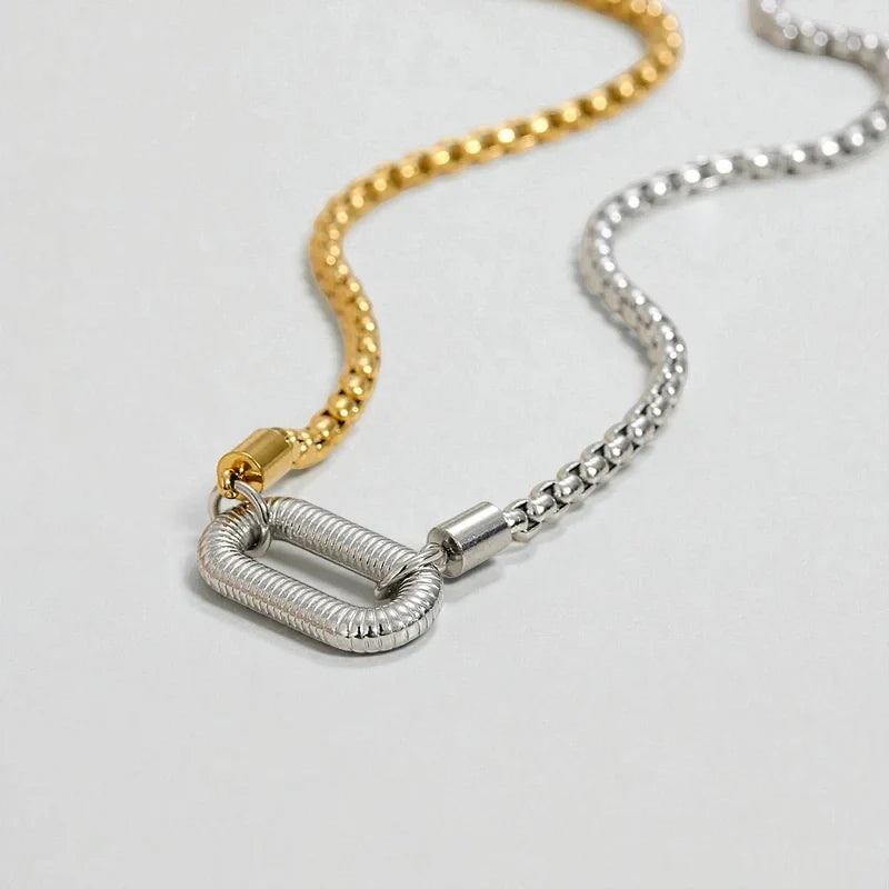 Διχρωμία που τραβά τα βλέμματα: χρυσή αλυσίδα από τη μία πλευρά, ασημί από την άλλη, ενώ το επίκεντρο του σχεδιασμού είναι ο εντυπωσιακός ασημί σύνδεσμος με ραβδωτή υφή.